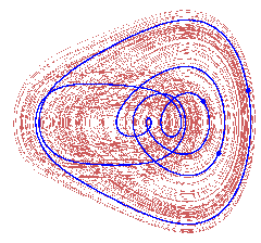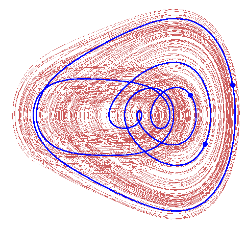 A chatic attractor (Red line) with its Poincare mapping (Blue points)